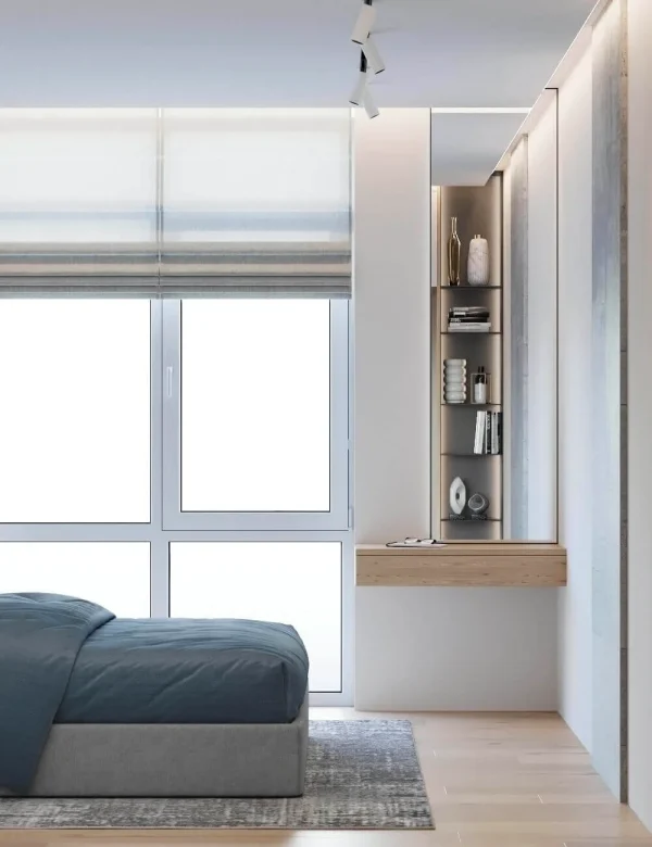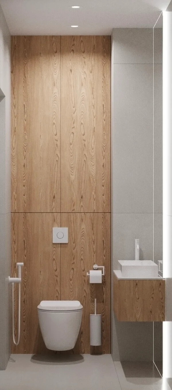 Акцентами стали – дерево светлого оттенка и синий цвет, именно они придали цвету и натуральности пространства.