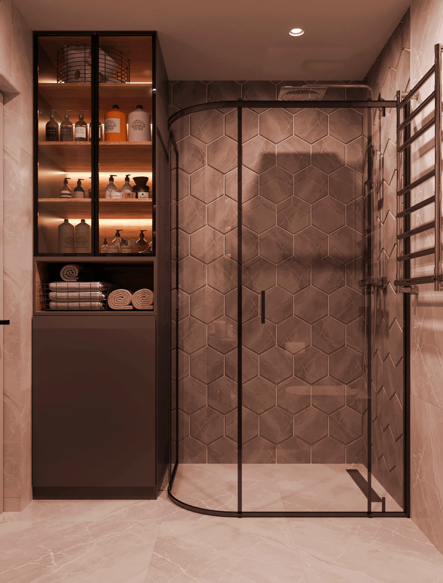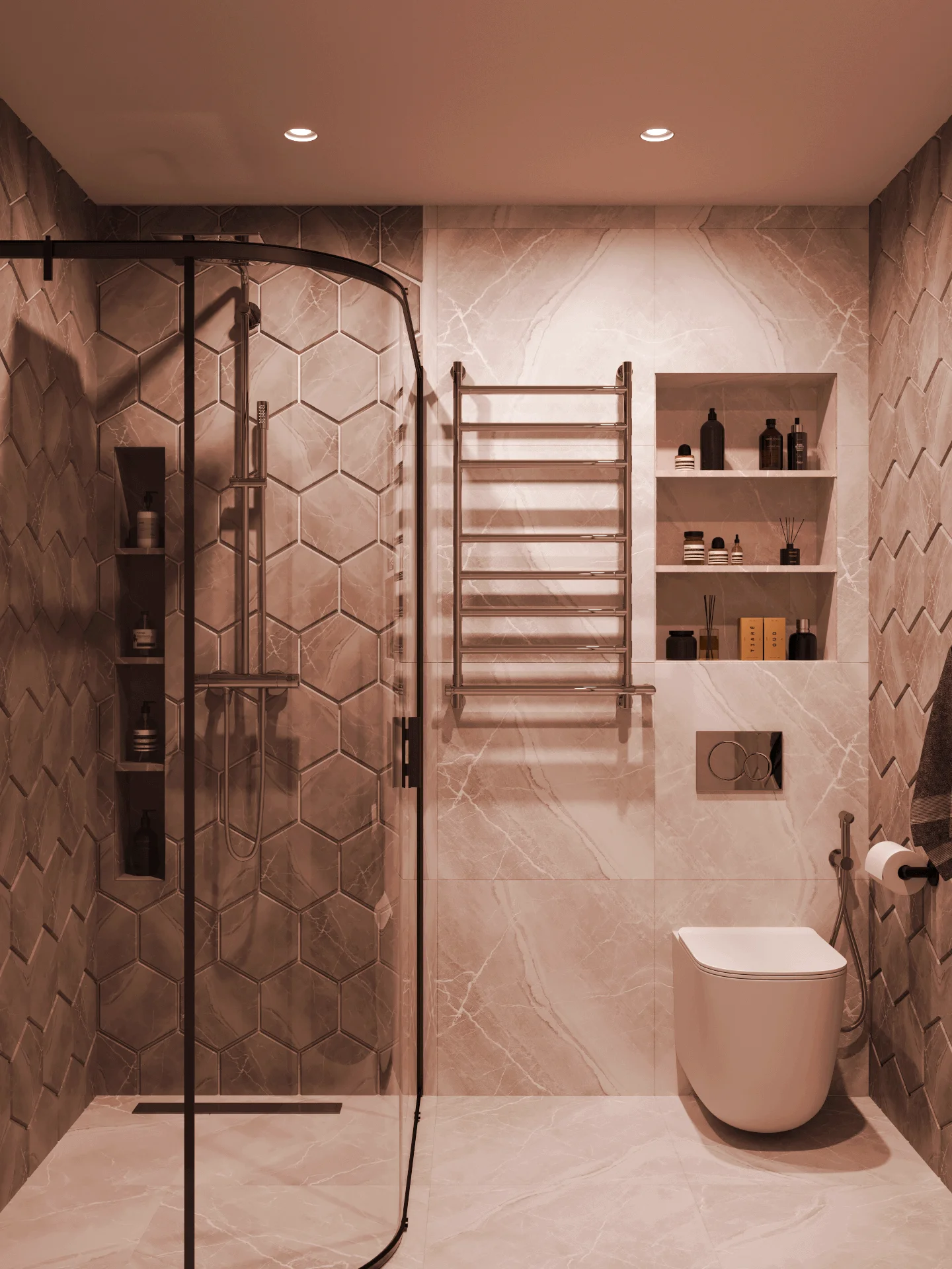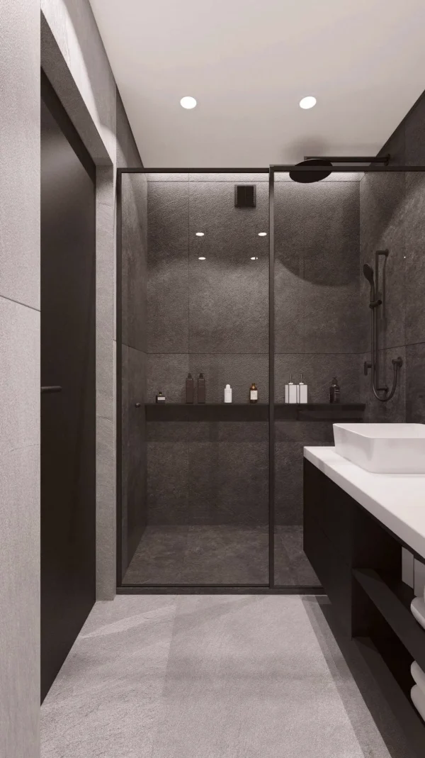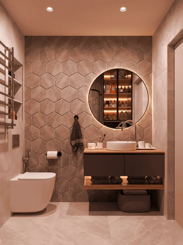 Также особенностью проекта выступают необычный выбор керамогранитной плитки в общей зоне и ванной комнате, конечно же по всей квартире использовали теплые полы.